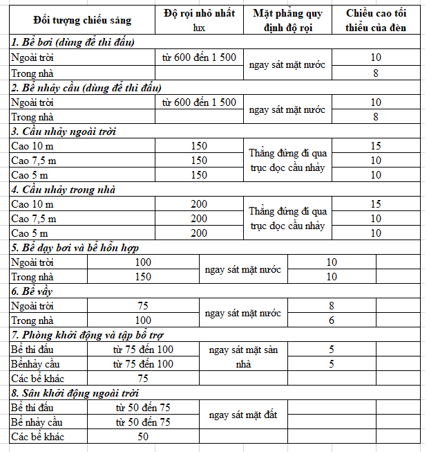 Ánh sáng cho bể bơi là tiêu chí rất quan trọng. Tiêu chí này phải được tính toán cẩn thận từ giai đoạn thiết kế cho đến khi vận hành. Không có quy định cụ thể đối với các bể bơi gia đình, còn đối với các bể bơi kinh doanh, bể bơi thi đấu thì được quy định chi tiết trong TVCN 4260:2012. Tổng hợp các tiêu chí như sau:
