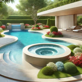 - Bể bơi tự nhiên: Kết hợp cây xanh, đá cuội, thác nước để tạo sự gần gũi, ấm cúng, như một hồ nước trong rừng.